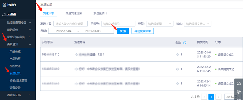 路徑[控制臺>語音通知>發送記錄],右側[發送日志]下輸入篩選條件即可進行查詢;
